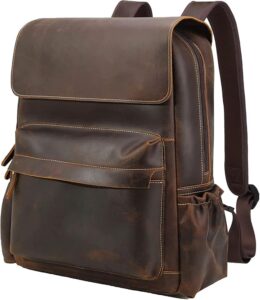 This backpack has it all: quality, style, and functionality. It’s made of genuine full-grain leather and comes with reinforced lining for added durability. Not only is it stylish, but it also includes padded mesh on the back panels to help reduce sweat and improve comfort. This backpack comes with plenty of compartments, including an elastic side pocket for a water bottle and a padded compartment for a laptop up to 15.6”.